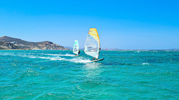 La baie Mikri Vigla à Naxos est l'un des meilleurs spots de planche des Cyclades, grâce à un effet venturi créé par la proximité de l'île de Paros. Les conditions sont idéales pour le windsurf, avec des températures allant de 25 à 30 degrés. La période propice pour pratiquer va de mai à octobre, et le vent « Meltem » souffle régulièrement avec une force moyenne de 20 nœuds.